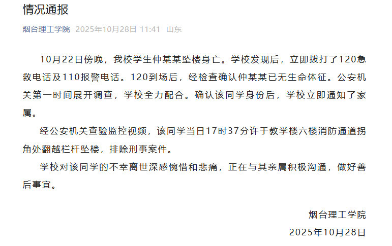 烟台工学院通报学生坠楼身亡:刑事案件已决